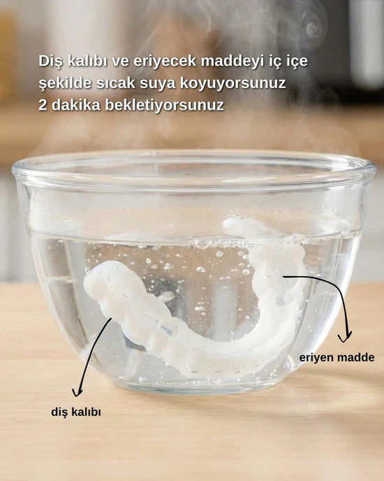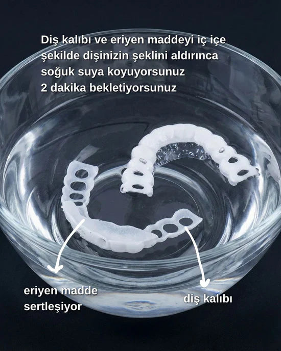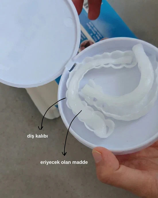 Setimiz; üst ve alt çene için özel tasarım veneerler, hijyenik saklama kutusu ve mükemmel uyum için gerekli olan termoplastik kalıplama kitini içerir.